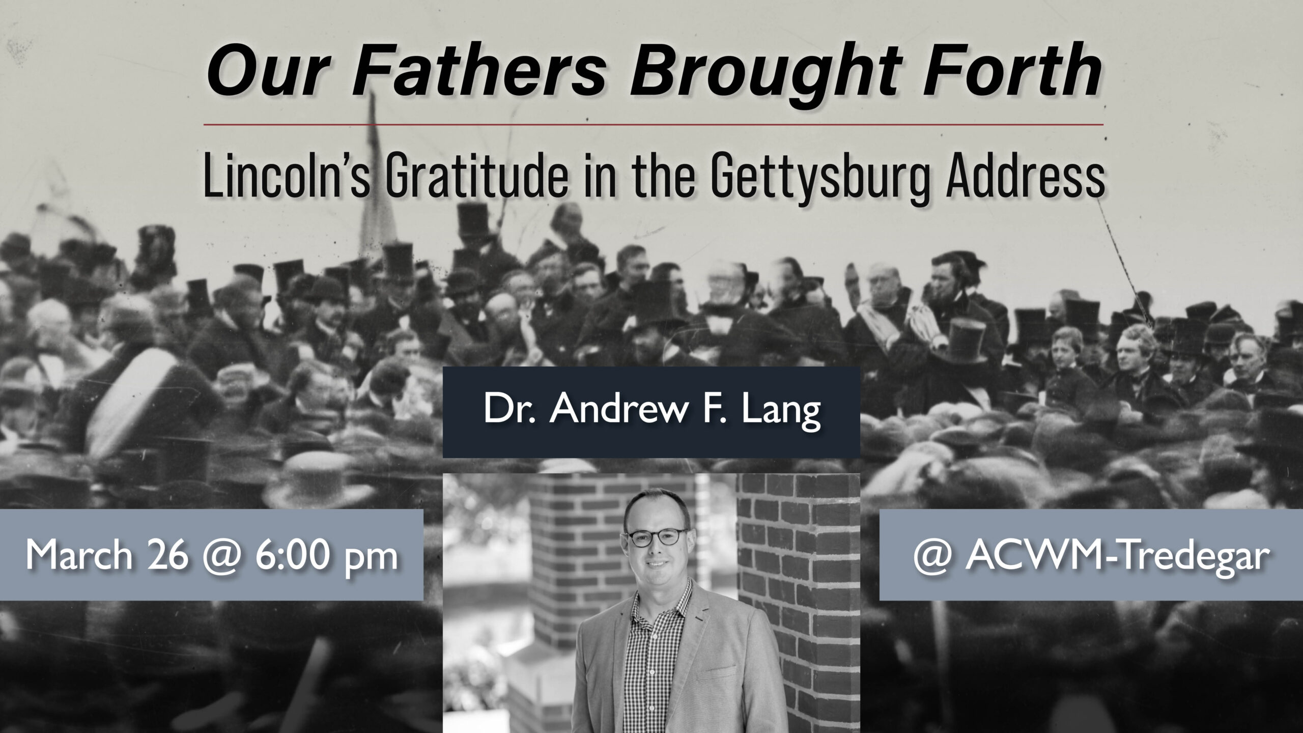 Reflecting on Lincoln and the ancient virtue of gratitude, an essential attribute of a free society, Dr. Andrew F. Lang reads the Gettysburg Address as a national expression of gratitude, honoring the past while charging the present to preserve freedom for the future. By situating Lincoln’s rhetoric within the political and military contexts of 1863, the talk connects 1776, 1863, and 2026, just as Lincoln intended. Members Reception at 5 pm